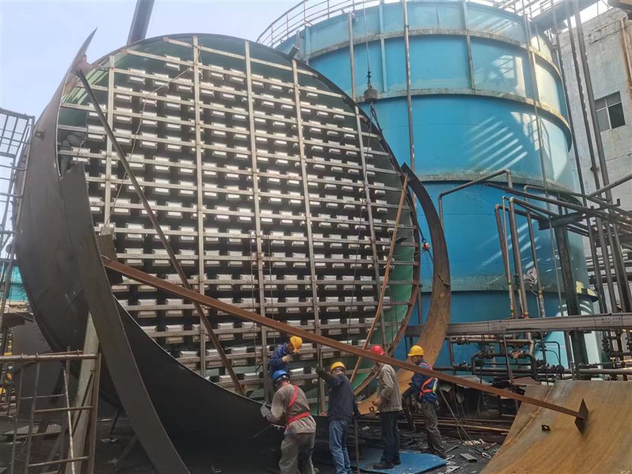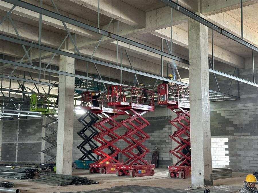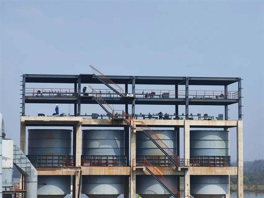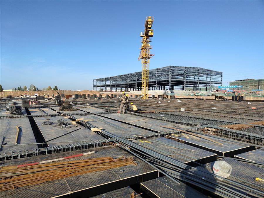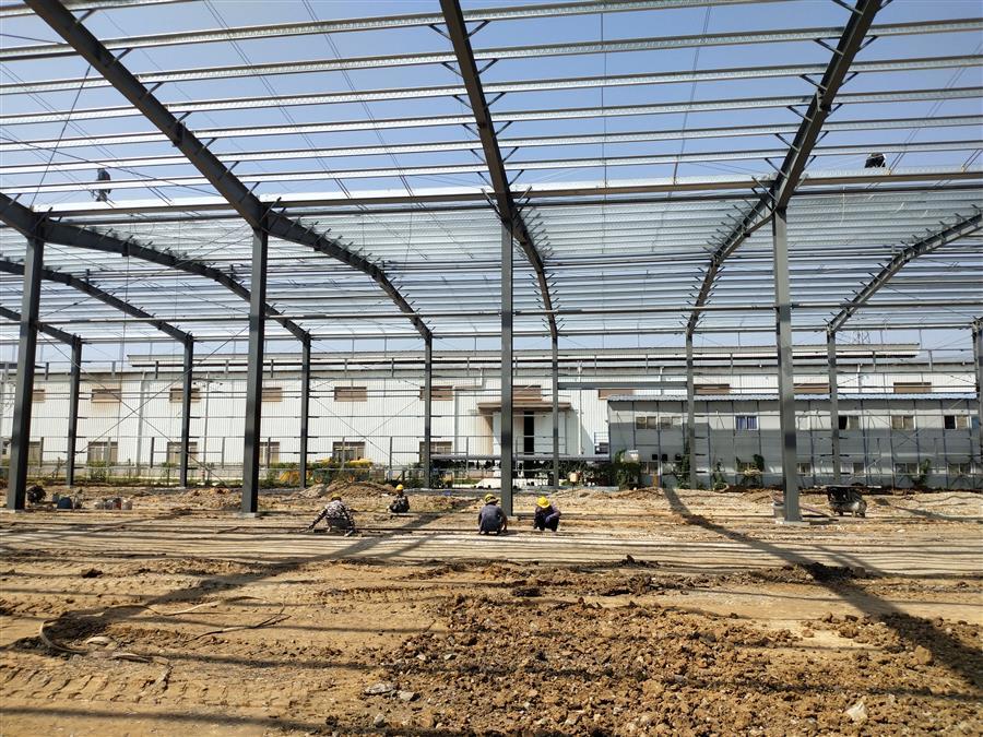 柳鋼環(huán)保公司鋼渣廠中間料場(chǎng)棚化項(xiàng)目之主體工程,工人正在加班開展工作。