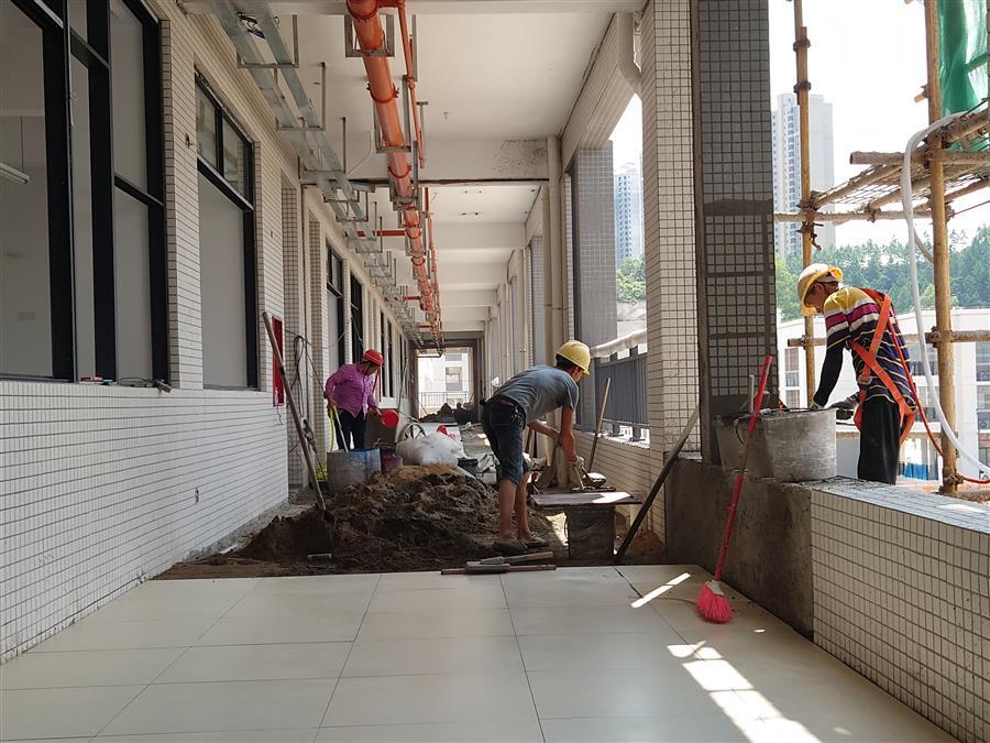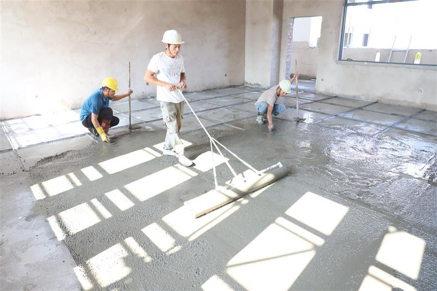 柳州市柳東新區(qū)明德中學(xué)項(xiàng)目,工人正在進(jìn)行4#綜合樓三層水磨石拌合料鋪設(shè)。