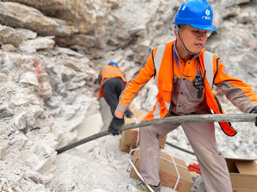 柳州市柳北區(qū)石碑坪古木村石灰?guī)r礦爆破工程,爆破作業(yè)人員正在進(jìn)行裝藥、網(wǎng)絡(luò)延時(shí)設(shè)置等作業(yè)。