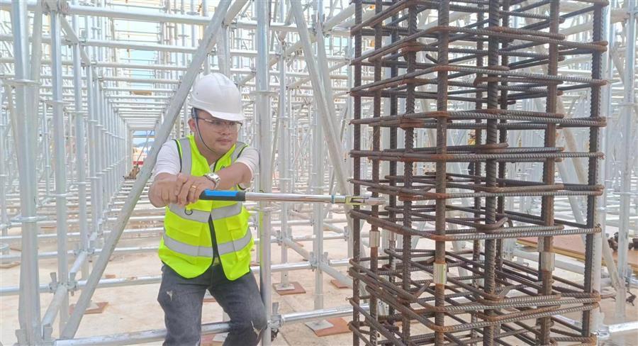 鹿寨智慧林業(yè)零碳循環(huán)產(chǎn)業(yè)園項(xiàng)目,管理人員正在進(jìn)行鋼筋套筒扭矩測(cè)試。