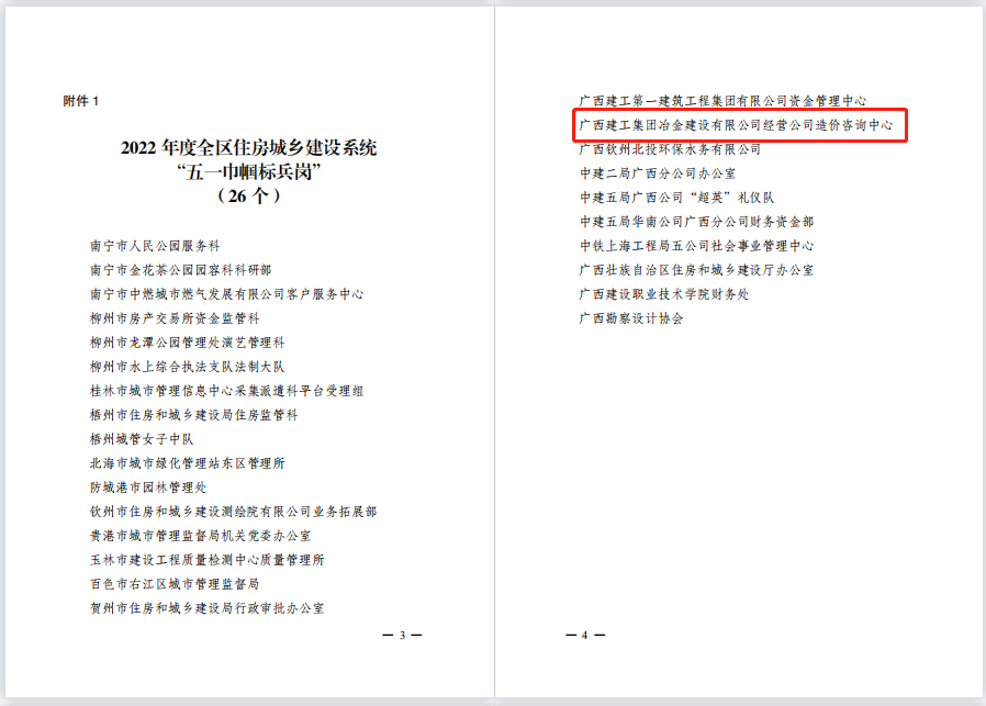 近日,廣西建設(shè)工會(huì)工作委員會(huì)下發(fā)了《關(guān)于命名2022年度全區(qū)住房城鄉(xiāng)建設(shè)系統(tǒng)“五一巾幗標(biāo)兵崗”“五一巾幗標(biāo)兵”的決定》,冶建經(jīng)營公司造價(jià)咨詢中心榮獲“五一巾幗標(biāo)兵崗”稱號(hào)。